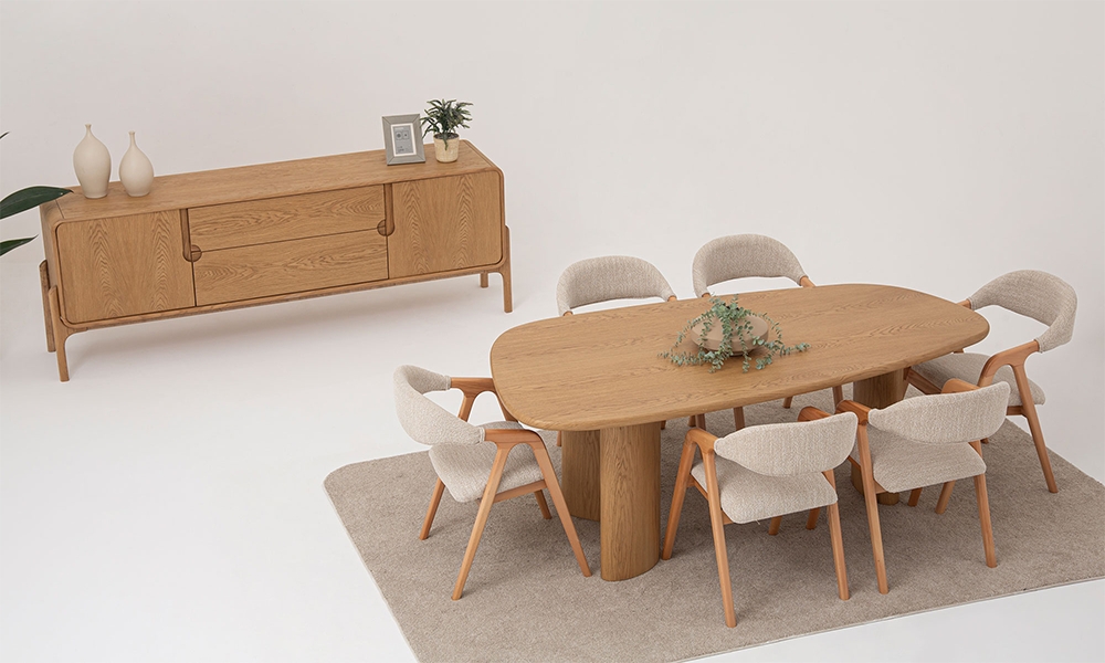 Dikdörtgen yemek masası, oval yemek masası olarak iki farklı versiyonda tasarlanmıştır.
